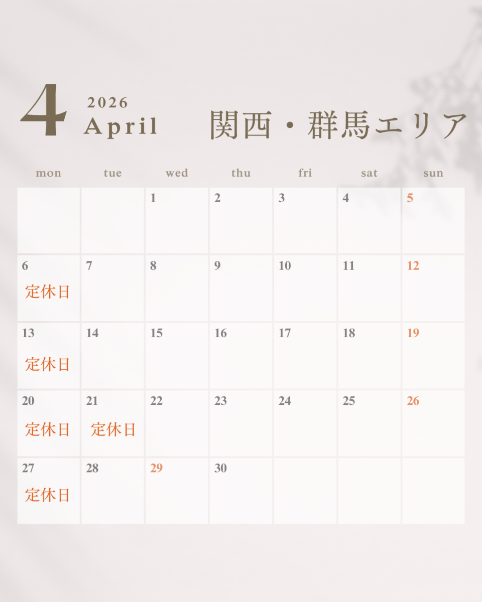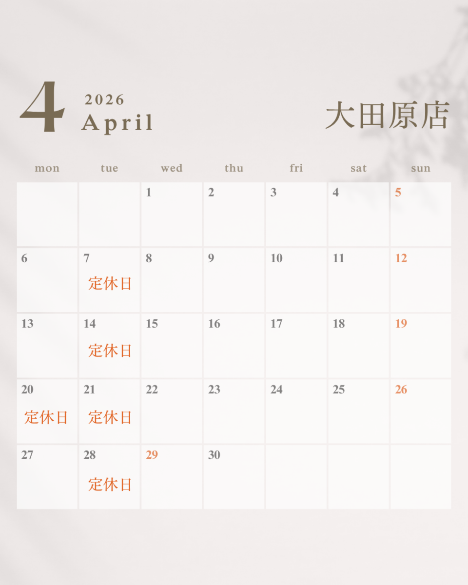 4月営業カレンダー 2026/03/26 いつも髪一をご利用頂き、誠にありがとうございます。 4月営業カレンダーのご案内です。 ※新大宮店、アルプラザ木津店、生駒駅店は無休で営業しております。 4月も皆様のご来店をお待ちしております。